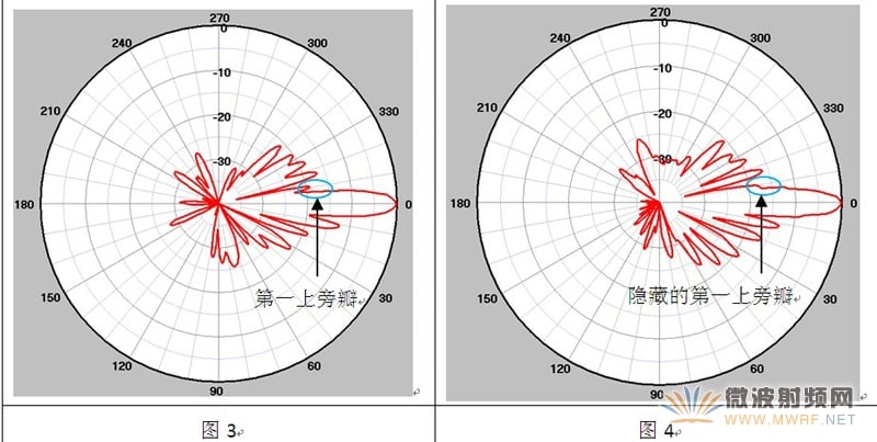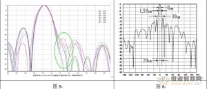 副瓣抑制是天線的重要指標(biāo),目前通??己舜怪泵娣较驁D的第一上旁瓣,如圖3所示。但在一定頻段內(nèi),總有一些頻點(diǎn)的第一上旁瓣很不明顯,似乎未按預(yù)定位置出現(xiàn),容易將第二上旁瓣誤認(rèn)為第一上旁瓣,如圖4、圖5所示,導(dǎo)致指標(biāo)評(píng)判錯(cuò)誤。對(duì)此,當(dāng)?shù)谝桓卑瓴幻黠@時(shí),需要在預(yù)定的第一零點(diǎn)和第二零點(diǎn)之間的角域內(nèi)找最大值來確定,通常是1~2倍θ3dB角域,如圖6所示。另外,也可按上側(cè)某個(gè)角域范圍內(nèi)的副瓣電平進(jìn)行評(píng)估,如從1倍 θ3dB處~30度范圍內(nèi),這樣既可避免上述情況,也有利于網(wǎng)絡(luò)覆蓋效果。