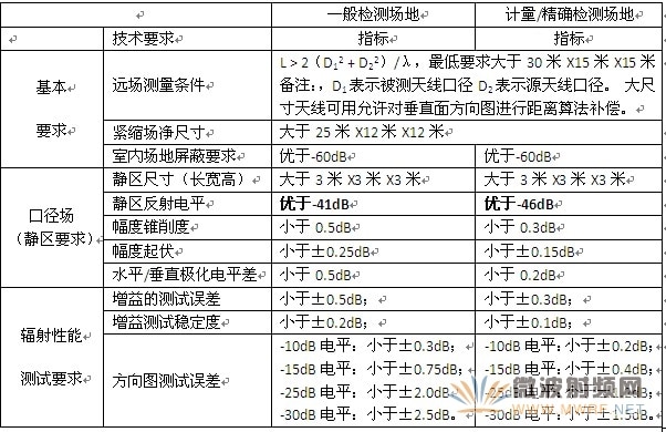 天線輻射參數(shù)要求在自由空間中進(jìn)行測(cè)試,現(xiàn)實(shí)中,只能盡可能的模擬自由空間,稱為準(zhǔn)自由空間。高質(zhì)量的現(xiàn)代微波暗室是目前最好的準(zhǔn)自由空間。通常有室內(nèi)遠(yuǎn)場(chǎng)測(cè)試、室內(nèi)緊縮場(chǎng)測(cè)試及室內(nèi)近場(chǎng)測(cè)試三類測(cè)試方法。理論上,這三類方法都是正確的,都有可能實(shí)現(xiàn)準(zhǔn)確的測(cè)試,但實(shí)際上由于各自硬件條件的限制、經(jīng)費(fèi)預(yù)算的限制、以及對(duì)測(cè)試效率的期望,導(dǎo)致每一種測(cè)試方法所對(duì)應(yīng)的實(shí)際系統(tǒng)會(huì)引入各自固有的測(cè)試誤差,從而限制了輻射參數(shù)測(cè)試的準(zhǔn)確性。對(duì)此,需要對(duì)場(chǎng)地進(jìn)行量化的要求,如靜區(qū)反射電平、尺寸的要求等等,保證測(cè)試精度。舉例如下(以直接遠(yuǎn)場(chǎng)和緊縮場(chǎng)輻射參數(shù)測(cè)試場(chǎng)地為例):