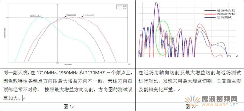 在近場(chǎng)測(cè)量沒有投入國(guó)內(nèi)移動(dòng)通信天線測(cè)試運(yùn)營(yíng)之前,行業(yè)內(nèi)的專家對(duì)于上述定義沒有異議。但在近場(chǎng)測(cè)量投入測(cè)試運(yùn)營(yíng)之后,有專家對(duì)方向圖的切割基準(zhǔn)有了另外一種說法,即按最大增益方向進(jìn)行切割。同樣以上面的天線為例,對(duì)于不同的頻點(diǎn),真實(shí)的波束水平面最大指向可能發(fā)生在96度,也可能在94度。從立體圖看,Θ=95度的水平面方向圖可能是各種各樣的:對(duì)稱的標(biāo)準(zhǔn)圓弧尖頂、圓弧平頂、偏斜一側(cè)或者同時(shí)兼有偏斜、馬鞍頂或者多波浪頂,以及各頻點(diǎn)指向的離散性等。同樣,對(duì)于垂直面方向圖,如果在最大值所對(duì)應(yīng)的Φ角去切割,則會(huì)由于波束偏斜的不同、儀表接收值抖動(dòng)的不同、頻點(diǎn)的不同,帶來Φ角的巨大變化。如下圖1、2所示,按最大增益方向切割方式,天線的測(cè)試誤差將會(huì)增大。