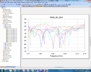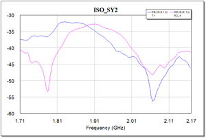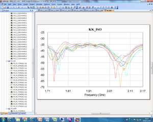 天線性能的一致性是指同一型號的天線產品的參數表現的吻合性,可以通過比較多個同類型產品的指標曲線的近似度來判斷。如圖4所示,為同一類型的多個天線電壓駐波比曲線的一致性對比,左圖的多個天線駐波比曲線趨勢一致,偏差較小,表明該類型天線駐波比性能比較一致;右圖的多個天線的駐波比曲線沒有規律,比較雜亂,表明該類型天線的駐波比性能一致性較差。圖5為天線隔離度性能的一致性比較,同樣左圖天線比右圖天線隔離度參數的一致性要好。因此,可以認為,左圖天線性能的一致性要好于右圖的天線。